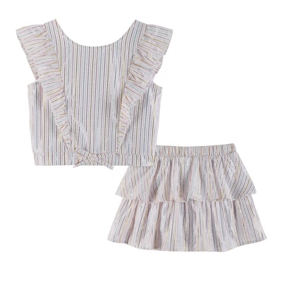This Girls Beige Lurex Skirt Set is perfect for the little lady who is always on the go! This girls dress set features a beige girls shirt with ruffled front and a matching ruffled girls skirt.