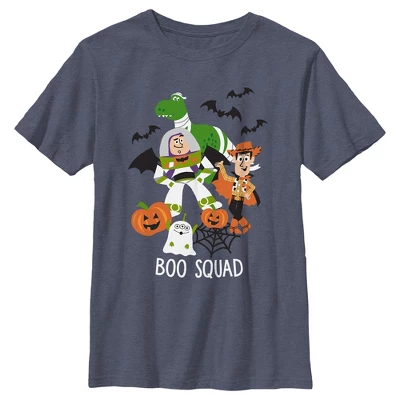 - Strut your stuff with this stylish new boys’ t-shirt that is perfect for Halloween! Featuring Buzz Lightyear, Woody, Rex, and a Little Green Man ready for trick-or-treating with the words: “Boo Squad” below them.