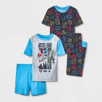Your child will love uniting with their favorite superhero team in their dreams with this 4-Piece DC Comics Justice League Pajama Set. Crafted from 100% cotton, this pajama set includes two snug-fit pairs for a soft feel and all-night cozy comfort. One pair includes a short-sleeve tee featuring Batman, Superman and Aquaman with their corresponding logos and solid sleep shorts. The other pair includes a short-sleeve tee and pajama pants, both featuring allover logo prints of DC superheroes. Great as coordinated sets, they can also mix and match the pieces together or with their other DC PJs for versatile sleepwear options.