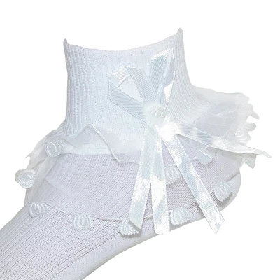 These adorable ruffle trimmed anklet socks dress up any outfit. Each sock has a ribbon bow with pearl accent in the middle. Ideal for school, church, weddings and more.