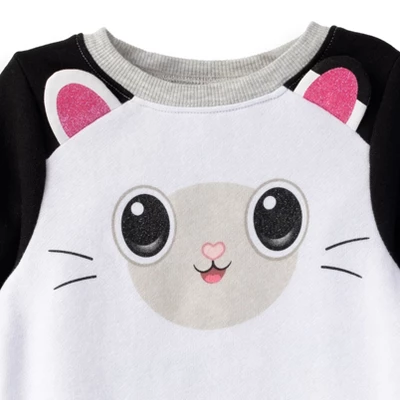 Pinch your cat ears and get ready for a cat-tastic adventure with this Gabby’s Dollhouse Sweatshirt Legging Set! Join Gabby and Pandy Paws as they shrink down to doll size to play with her other cat friends in their dollhouse. Bake with Cakey Cat, garden and cast magic with Kitty Fairy, make crafts with Baby Box and Mama Box, play games and sports with Carlita, write and read bedtime stories with Pillow Cat, create and perform music with DJ Catnip, and do science experiments with MerCat. Your little one will look so cute and have so much fun in this gear featuring her favorite TV characters, she will always want to wear it.