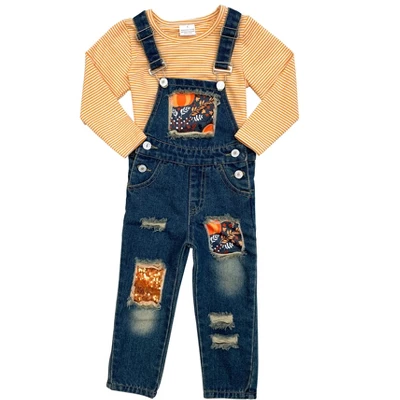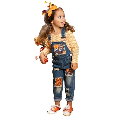 Your mini fashionista will look fall-tastic in our patched overall jeans set.The striped top and fun overalls make such a fashionable combo.Serving elevated style to make pumpkin harvests, apple picking, and family gatherings extra memorable!.