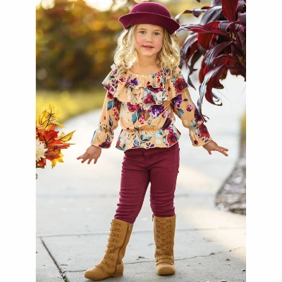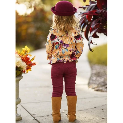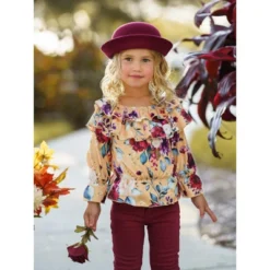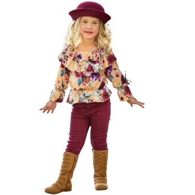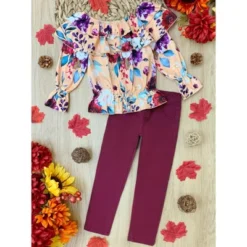 This trendy, colorful floral top and burgundy jeans set are sure to make your little girl’s day that much better! She’ll stand out from the ordinary all season long!.