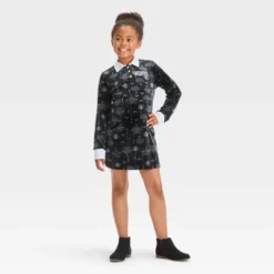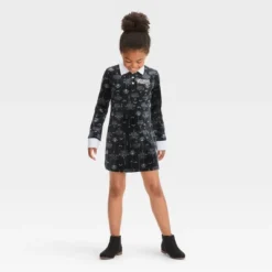 This Netflix Wednesday Addams Dress is perfect for wearing throughout the Halloween season and beyond. Your child will love flaunting their fandom for their fave character with this printed pullover dress, which is designed like Wednesday Addams’ iconic dress with a white gothic print on a black background. Made of stretchy, midweight jersey fabric, the knee-length dress features long sleeves and a collared neckline with a three-button placket front that are both highlighted in white to complete the look with a pop of contrast.