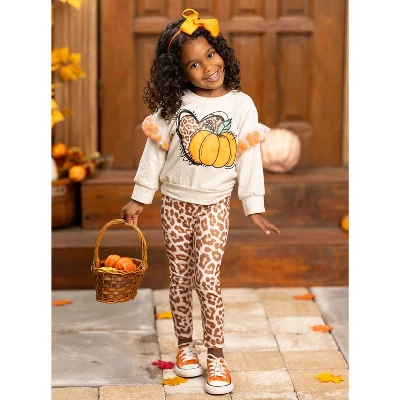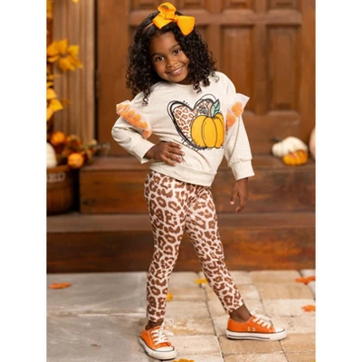 - Long-sleeve pullover top with leopard print heart and pumpkin graphic, pom-pom/mesh sleeve applique, and matching leopard print leggings