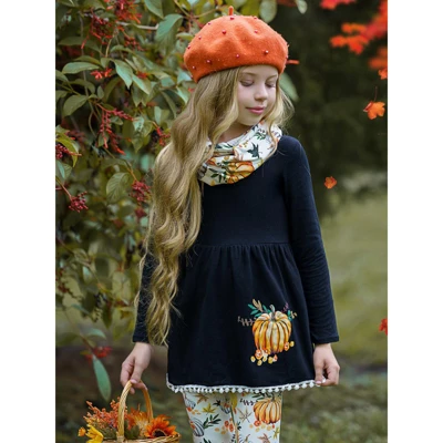 - Long-sleeve tunic with pumpkin graphic on the skirt, pom-pom hem, pumpkin print leggings, and a matching infinity wrap skirt