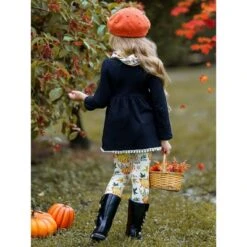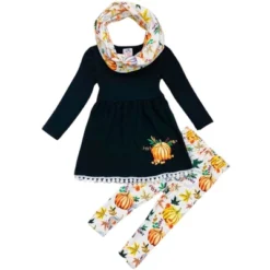 Help her fall into harvest-ready style with this pumpkin-themed three-piece legging set made with a hint of stretch for comfort all day long.Everything from the pumpkin print to the cute pom-poms on the hem will have her looking her adorable best..