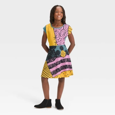 The Nightmare Before Christmas Sally Dress is perfect for wearing during the Halloween season. Your child will love flaunting their fandom for the classic movie with this printed pullover dress that is designed like Sally’s iconic patchwork dress in yellow, pink, teal blue and black. Made of a stretchy, lightweight scuba fabric, the knee-length dress features a scoop neckline and sleeveless design.