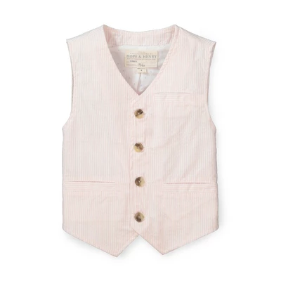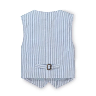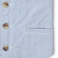Our traditional seersucker vest shows off his preppy style to perfection. Ours is cut in yarn-dyed organic cotton seersucker, featuring all the classic details: button front with faux horn buttons, welt front pockets and chest pocket, and adjustable back strap.
