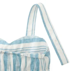 - Playful bow at center chest and wide legs. Elastic in the back bodice and button closure straps for an adjustable fit.