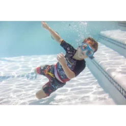 - Contrast raglan sleeves; Awesome sublimation print design; UPF 50+ material for UVB and UVA protection and worry-free sun time; Mesh-lined swim shorts; Drawstring closure; Elastic waist for better fit; Pull on closure