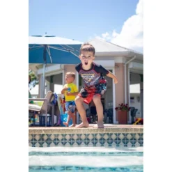 - Stylish kid’s rash guard shirt and board shorts bathing suit with a comfortable fit and easy-to-dress design; youth fashion swimwear made from material that protects your child from the sun and is safe on skin