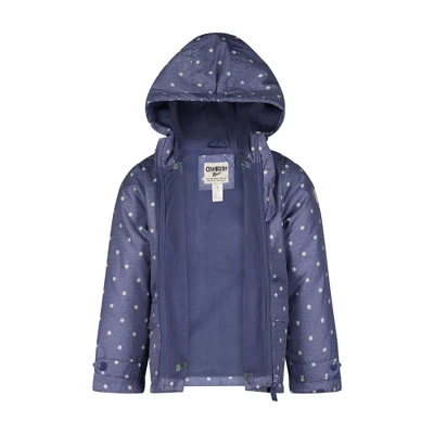 OshKosh B’gosh® Baby Girls’ Jacket is fleeced lined. This jacket is also water and wind resistant. The perfect everyday jacket for your child. It is versatile and can be paired with any outfit. It features 2 pockets and a fun dot design. The hood offers protection from wind and rain.