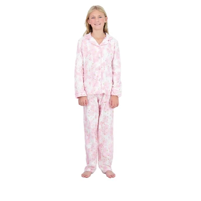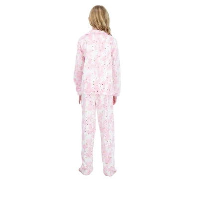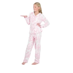 - DESIGN: Featuring a 2-piece hearts fleece girlÂ’s pajama set that is the perfect blend of comfort and style, this is one set we know youÂ’re not going to want to miss out on. The set is designed to have a long-sleeved button down, placket button-front coat top that have a classic collar neckline, and a side pocket detail. Furthermore, it has straight-legged long pajama pants for girls that have an elastic waistband, ensuring a secure and comfortable fit throughout the night. The icing on the cake is the adorable matching scrunchie.
