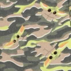 - Featuring this lovable creature who may look like a Baby Yoda, but is referred to as The Child scattered on an army style camo print and the Mandalorian with The Child on top of “The Mandalorian Starwars”
