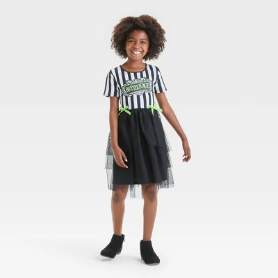Your child will find this Beetlejuice Tutu Dress perfect to wear all through October or to any occasion with a spooky theme. The pullover dress features a short-sleeve jersey bodice with black-and-white stripes and a “Beetlejuice” logo across the front. A flouncy black tiered tutu skirt with an asymmetrical hemline and green bow accents at the waist completes the look with ballerina-worthy flair.